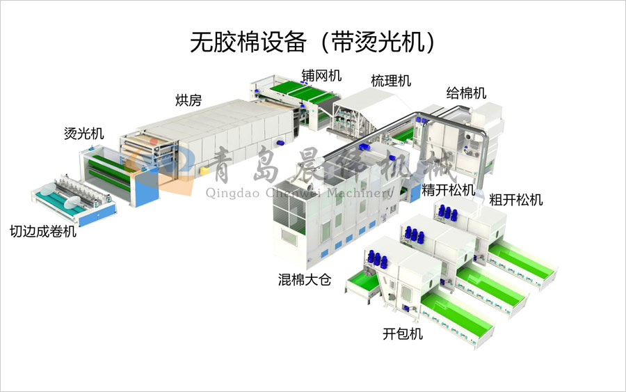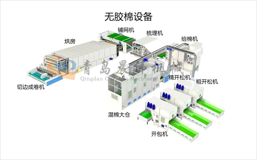 開(kāi)包機(jī)-開(kāi)松機(jī)-振動(dòng)給棉機(jī)-梳理機(jī)-鋪網(wǎng)機(jī)-烘房-切邊成卷機(jī)