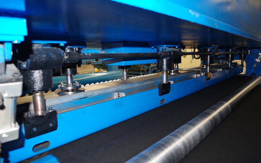 5. CWPW-鋪網(wǎng)機(jī):用于將梳理纖網(wǎng)通過移動(dòng)小車交叉折疊為所需幅寬和定量的多層纖網(wǎng),以供后道工序使用。鋪網(wǎng)輥采用特殊結(jié)構(gòu),加裝壓網(wǎng)輥和導(dǎo)流板,不飄網(wǎng)不起皺,五只大功率電機(jī)精確控制各部件的運(yùn)動(dòng),電動(dòng)輸出簾高度調(diào)節(jié)裝置