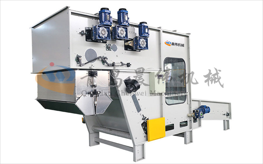 將各種等級(jí)整包或半包料進(jìn)行初步打開,無需人工抖棉,降低勞動(dòng)強(qiáng)度,通過稱重系統(tǒng)PLC計(jì)算進(jìn)行準(zhǔn)確配比,均勻平鋪到長簾上。